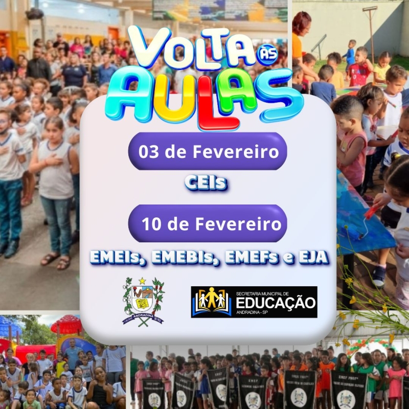 - As (EMEI), as Escolas Municipais de Educação Básica Integral (EMEBI), as Escolas Municipais de Ensino Fundamental (EMEF) e a Educação de Jovens e Adultos (EJA) começam suas atividades no dia 10 de fevereiro de 2025.