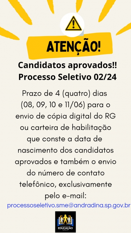 Todos os candidatos aprovados no processo seletivo 02-2024 devem encaminhar documento com foto digitalizado e numero do telefone
